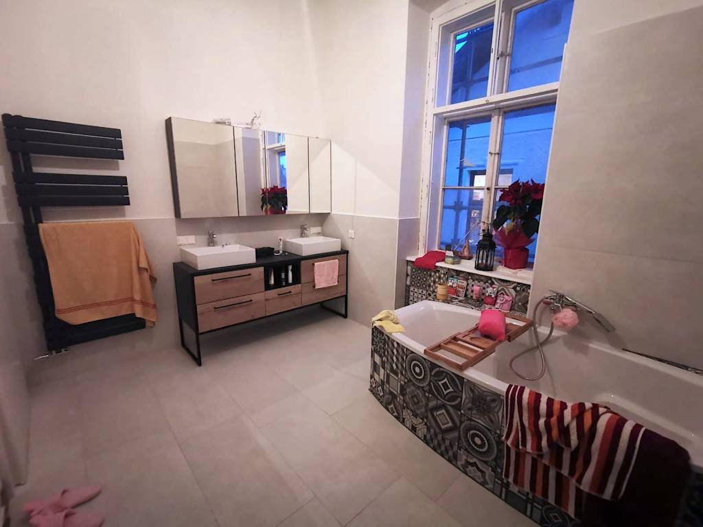 Beim Badezimmer war für uns von Anfang an klar, dass es eine Wohlfühloase werden muss. Das war aber genau genommen nicht so schwer, da wir in unserer Wohnung jetzt auf 4 qm eine Dusche, Waschmaschine und Waschbecken haben. Im Haus haben wir ca 12 qm und unsere Dusche ist gefühlt so groß wie unser gesamtes altes Bad. Besonders wichtig war uns auch eine Badewanne – die hat uns in den letzten fünf Jahren echt gefehlt. Wir haben sogar die Hotels in unseren Urlauben danach ausgesucht, ob es eine Badewanne am Zimmer gibt. Zum Glück ist damit jetzt Schluss und wir konnten unsere Wohlfühloase so planen, wie wir uns das vorstellen.