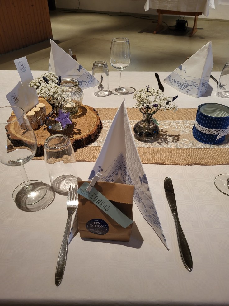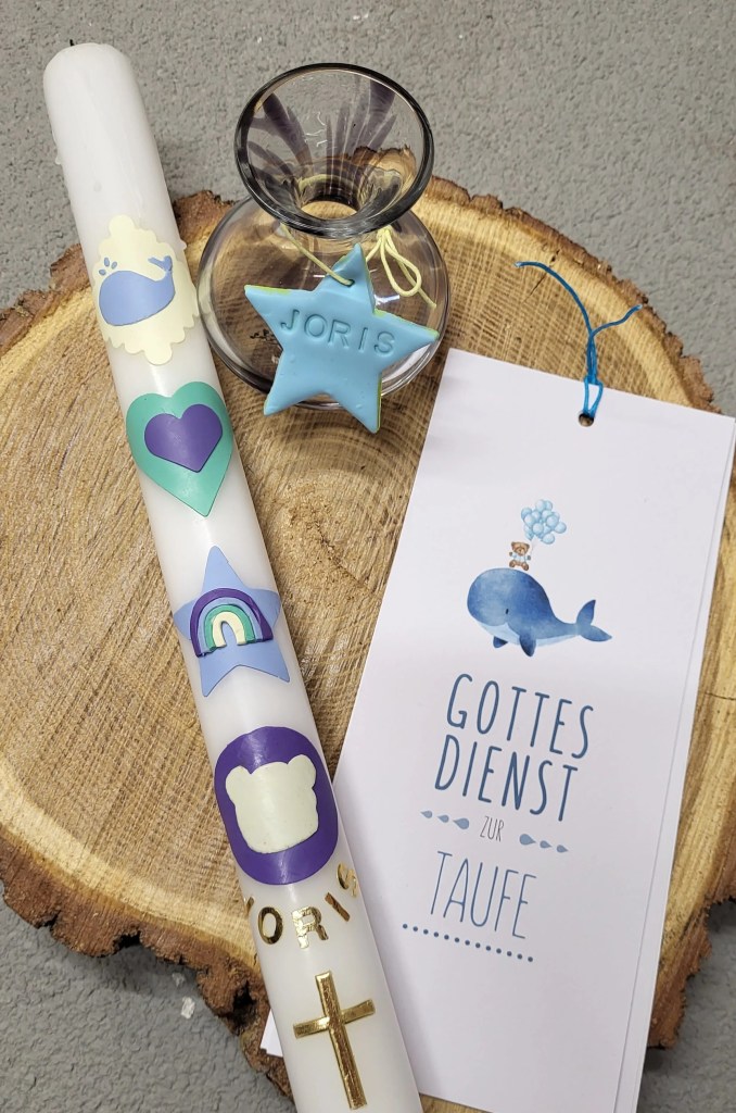 Die Taufkerze haben mein Mann und ich gemeinsam mit der Taufpatin unseres Sohnes gemacht und ich muss sagen, auch wenn wir am Anfang ziemlich planlos waren, bin ich ziemlich stolz drauf. Die Vasen haben wir auf unserer Baustelle gefunden (ein ganzer Karton Damenspenden vom Ortsball in den 1970er-Jahren…) und mit Fimo-Sternen aufgehübscht. Die Gastgeschenke waren selbstgebackene Käsekekse – das Rezept folgt bestimmt auch bald hier. In den Kork-Aufstellern waren kleine Fotos von unserem Schatz, die sich unsere Gäste als Andenken mit nach Hause nehmen durften.