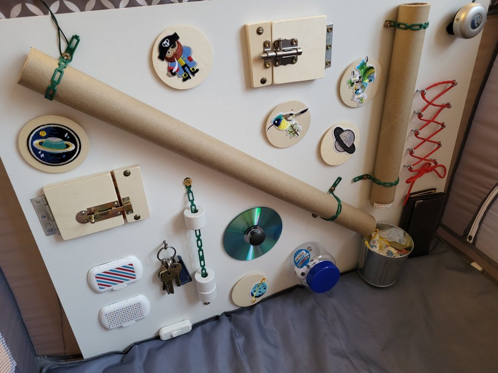 Ursprünglich wollten wir auch eine alte Computertastatur drauf montieren, weil unser Sohn immer sehr gerne „helfen“ will, wenn jemand am Computer sitzt. Die Tastatur hätte aber so viel Platz auf dem Board eingenommen, dass wir sie ihm einfach extra hingelegt haben. Immer wieder drückte er Tasten und amüsierte sich über Haptik und Geräusche. Mittlerweile haben wir ihm die Tastatur aber wieder weggenommen, da er herausgefunden hat, wie die Tasten runtergelöst werden können. Die einzelnen Tasten steckt er dann in den Mund – das war mir doch zu gefährlich.