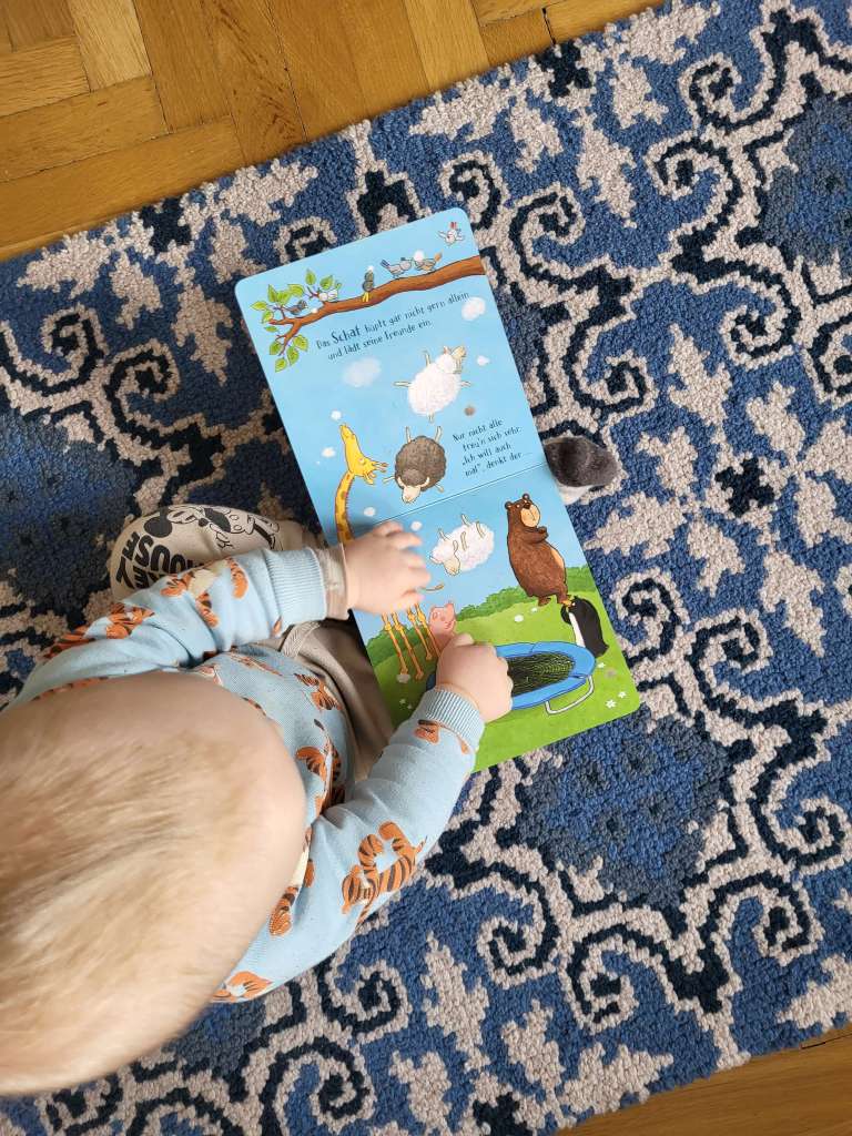 Die Seiten sind allerdings aus Papier, also muss das Kind wirklich ein bisschen älter dafür sein. Insgesamt ist es ein hochwertiges Buch mit dickem Kartonbuchdeckel, das sogar klimaneutral produziert wurde. Die Illustrationen sind sehr bunt und lustig gemacht – sie regen richtig zum Mitmachen an.