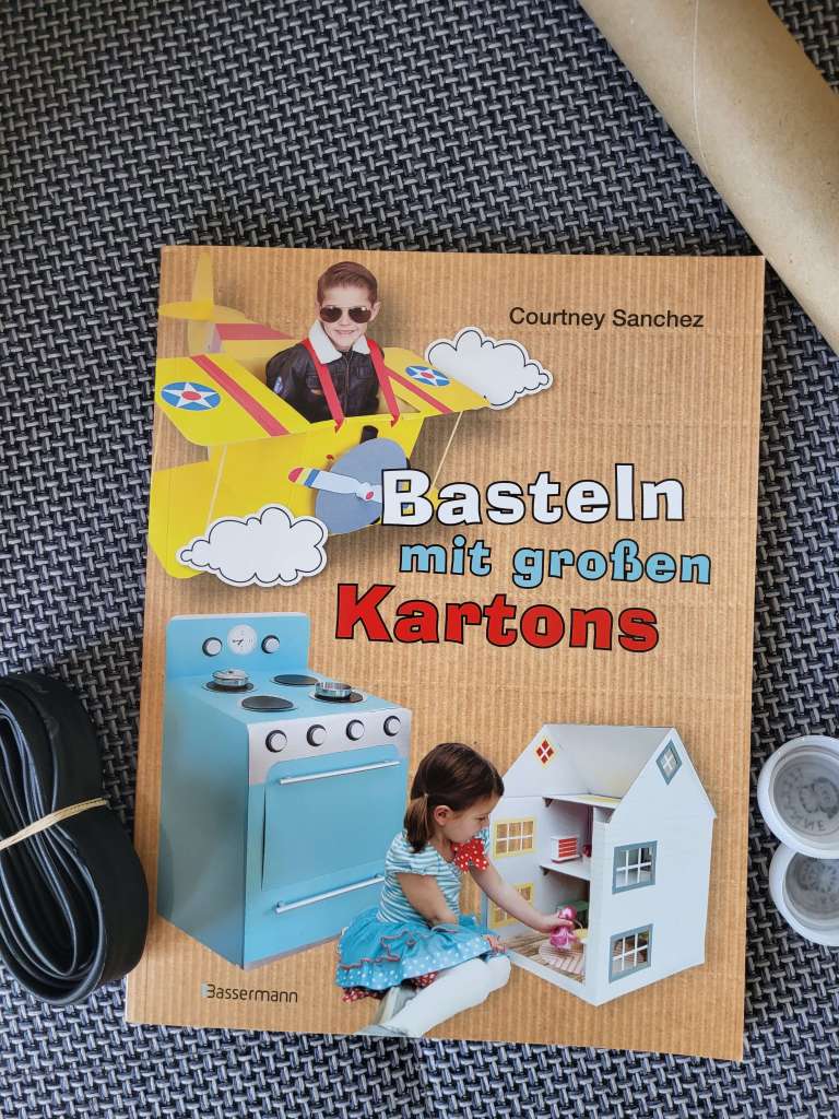 Von meiner Schneiderin habe ich vor einiger Zeit sehr große, stabile Kartons bekommen. Sie meinte „Du hast doch ein kleines Kind und bist kreativ, bau ihm doch ein Haus draus.“ Passend dazu – weil ich mich dann doch auch noch ein bisschen inspirieren lassen wollte – habe ich das Buch „Basteln mit großen Kartons“ von Courtney Sanchez bekommen. Darin enthalten sind viele tolle Ideen, von der Puppenküche angefangen über eine Rakete, ein Boot und einem Kasperltheater. Prinzipiell kann man sich das eh alles auch ganz gut vorstellen, aber die Step-by-Step-Anleitungen mit Fotos finde ich doch sehr hilfreich. Auch die Tipps zur Stabilisierung von Karton sind super.
