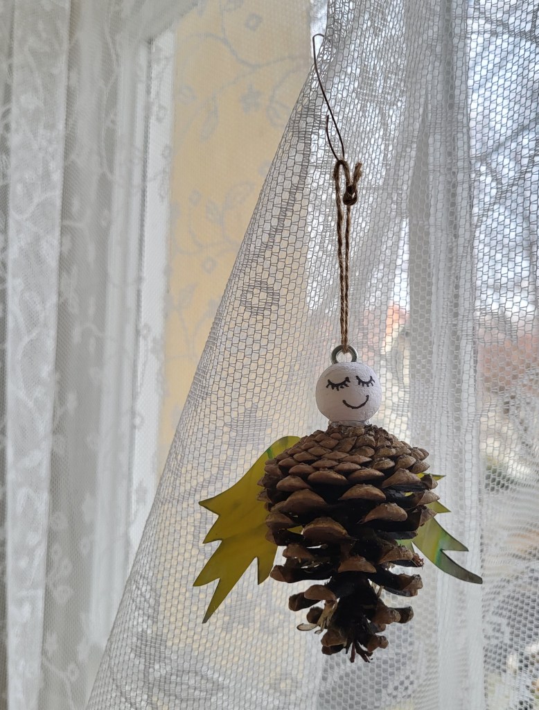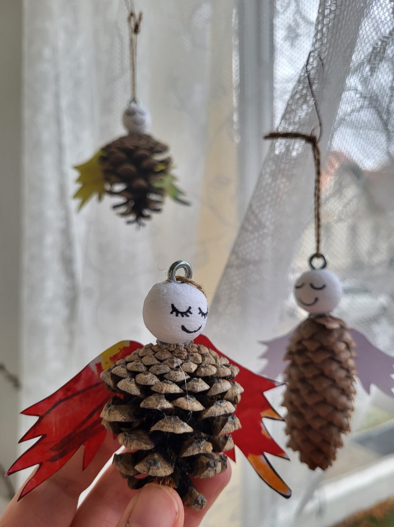 Als Deko für unsere Fenster haben wir Zapfenengel gebastelt: dafür habe ich meinen Sohn einfach mal mit Fingerfarben malen lassen. Aus seinem Kunstwerk habe ich dann Engelsflügel ausgeschnitten, die ich auf einen Zapfen geklebt habe. Eine weiße Wattekugel (Durchmesser 20mm) als Kopf bemalt, eine Ringschraube als Aufhängung hineingeschraubt, den Kopf auf den Zapfen geklebt und fertig ist der Engel.