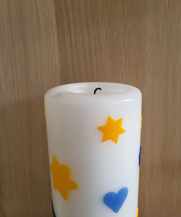 Mit schon ein bisschen größeren Kindern kann man Kerzen selbst gestalten und verschenken. Dafür habe ich Wachsplatten in bunten Farben gekauft sowie weiße Stumpenkerzen. Aus den Wachsplatten mit (alten) Keksausstechern Motive ausstechen, leicht mit den Fingern anwärmen und fest auf die Kerze drücken.