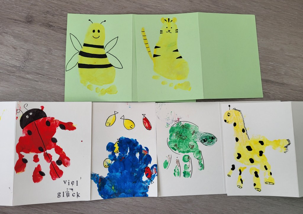 Wer gerne die kreativere Variante mit den Hand- und Fußabdrücken für seinen Kalender wählen möchte, findet hier noch ein paar Ideen, die wir auf Grußkarten gedrückt haben: