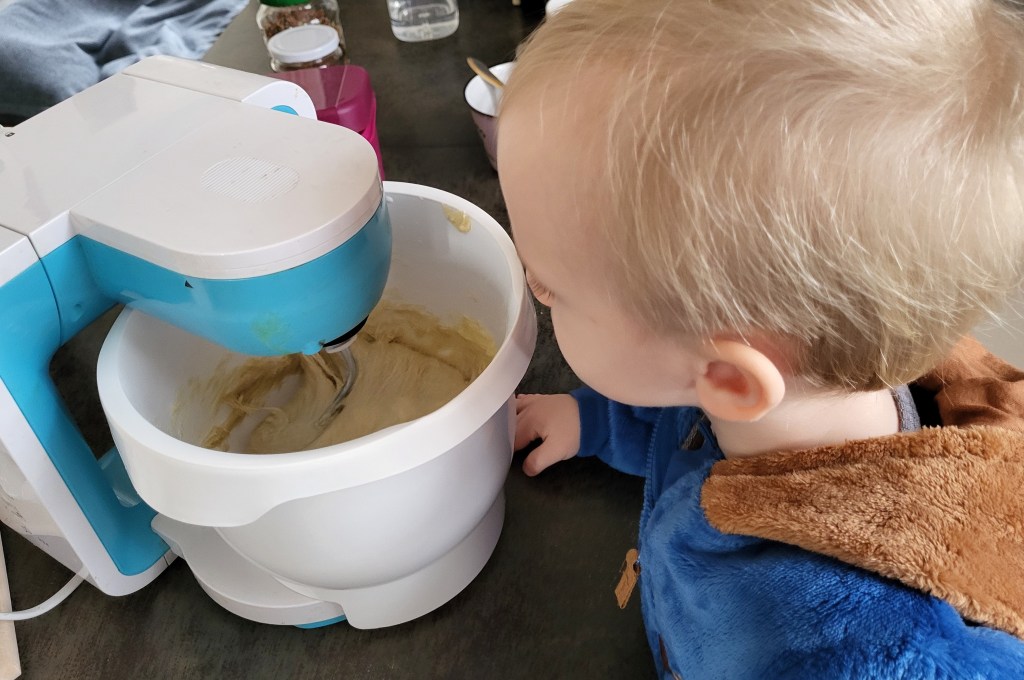 Anschließend den Teig von der Küchenmaschine ca 10 Minuten kneten lassen. Mein Sohn fand es faszinierend, der Küchenmaschine beim Kneten zuzuschauen. Diese Zeit habe ich genutzt, um die Zutaten für den nächsten Teig (Bagelsrezept weiter unten) vorzubereiten und verwendetes Geschirr schon mal in den Spüler zu räumen. Zwischendurch habe ich immer wieder die Küchenmaschine gestoppt, um den Teig zu begutachten. Mein Sohn durfte dann die Küchenmaschine wieder einschalten, was das anschließende Beobachten des Knetens gleich nochmal spannender machte.