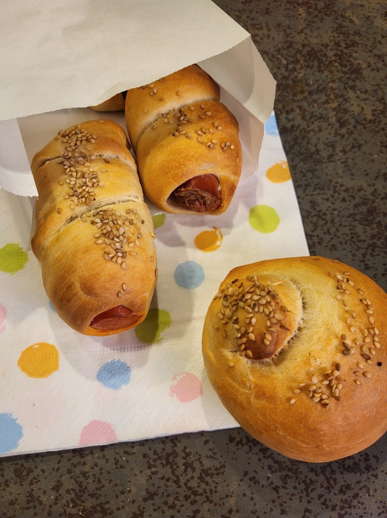 Das Buch ist hübsch gestaltet, die Rezepte einfach gehalten. Genau richtig, wenn es mal schnell und gelingsicher gehen soll. Ich kann vor allem das Rezept für Laugenweckerl (im Buch: Laugenigel) und das für eingebackene Würstel empfehlen. Beides ist relativ rasch gemacht und schmeckt auch am nächsten Tag noch lecker und weich. Die Laugenweckerl habe ich nicht als Igel gebacken, sondern einfach runde Weckerl gemacht, die ich ein bisschen zusammengedrückt und in der Mitte kreuzweise eingeschnitten habe. Die eingebackenen Würstel habe ich außerdem mit Sesam bestreut. Man kann übrigens auch gut Käsekrainer nehmen – da würde ich die Würstel allerdings nicht vorher halbieren, damit der Käse nicht ausrinnt.