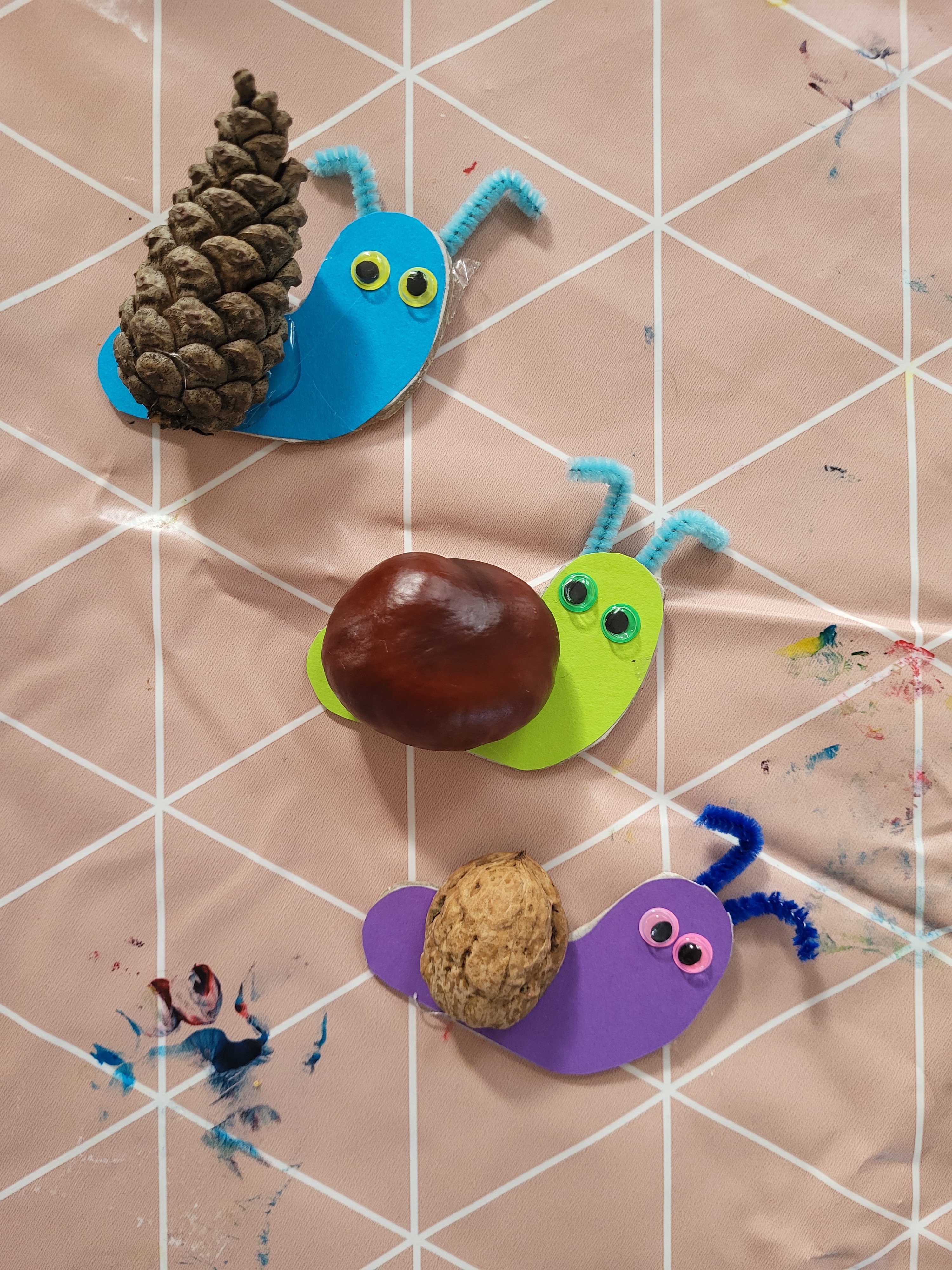 Aus gesammelten Zapfen, Nüssen und Kastanien haben wir kleine Schnecken gebastelt. Mein Sohn liebt Schnecken und das Aufkleben von Wackelaugen, die ideale Bastelei also. Die Schneckenkörper habe ich aus Karton vorbereitet, Schneckenhäuser ausgesucht, Augen und Häuser aufgeklebt hat dann mein Sohn.