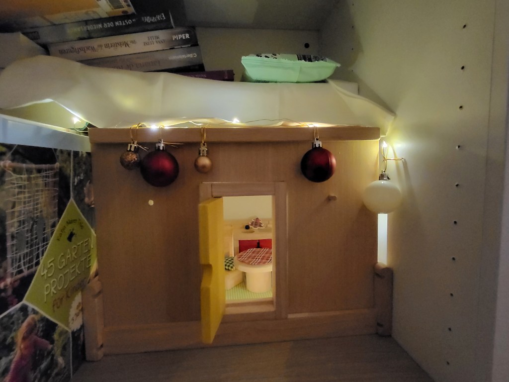 Statt einem Adventkalender im herkömmlichen Sinn durfte ein Wichtel bei uns einziehen. Aber das Konzept von „der Wichtel schläft den ganzen Tag“ erschien mir für meinen Zweijährigen irgendwie schwer zu fassen, wenn der Wichtel in keinem Bett liegt (Klassischerweise lebt der Wichtel im Advent ja nur hinter einer Tür an der Wand. Ich bin sicher, mein Sohn hätte an der Tür solange gezogen und sie versucht zu öffnen, dass schlussendlich die Tür abmontiert und die Illusion des Wichtel-Zuhause zerstört gewesen wäre). Daher habe ich ein kleines altes Puppenhaus gestaltet, in dem ein Wichtel gemütlich im Bett schlafen konnte. Das Puppenhaus hatte ich noch aus meiner Kindheit, aber ein Wichtel musste her. Und den wollte ich natürlich selber machen. Also habe ich kurzerhand zur Häkelnadel gegriffen, mich erinnert, was mir meine Oma mal beigebracht hat, und los ging’s. Der gehäkelte Wichtel hat dann tatsächlich jeden Tag geschlafen und nachts kleine Überraschungen oder Aufgaben bereitgestellt. Ich war echt überrascht, wie zivilisiert mein Sohn war. Er wollte zwar jeden Tag in der Früh zuallererst ins Wichtelhaus schauen, aber er hat nie hineingegriffen oder versucht, den Wichtel herauszuholen oder zu wecken.