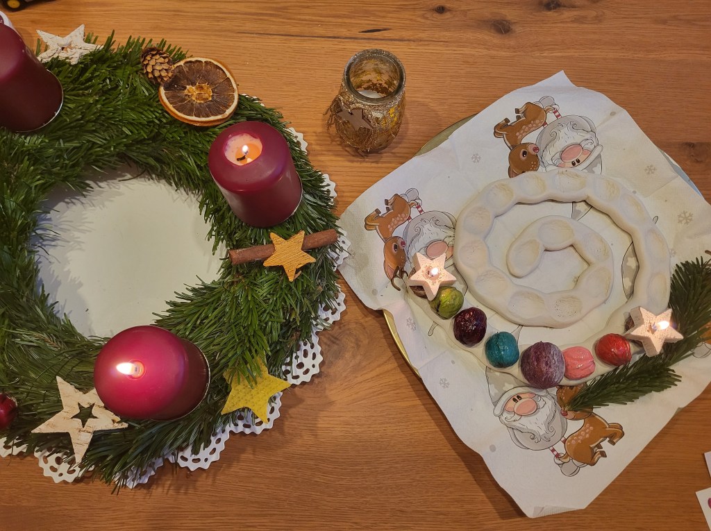 Als mein Sohn noch sehr klein war, hatten wir eine feuerfreie Adventkranzalternative (siehe HIER). Mittlerweile haben wir einen mit echten Kerzen, weil es ihm sehr viel Spaß macht, die Kerzen auszublasen.